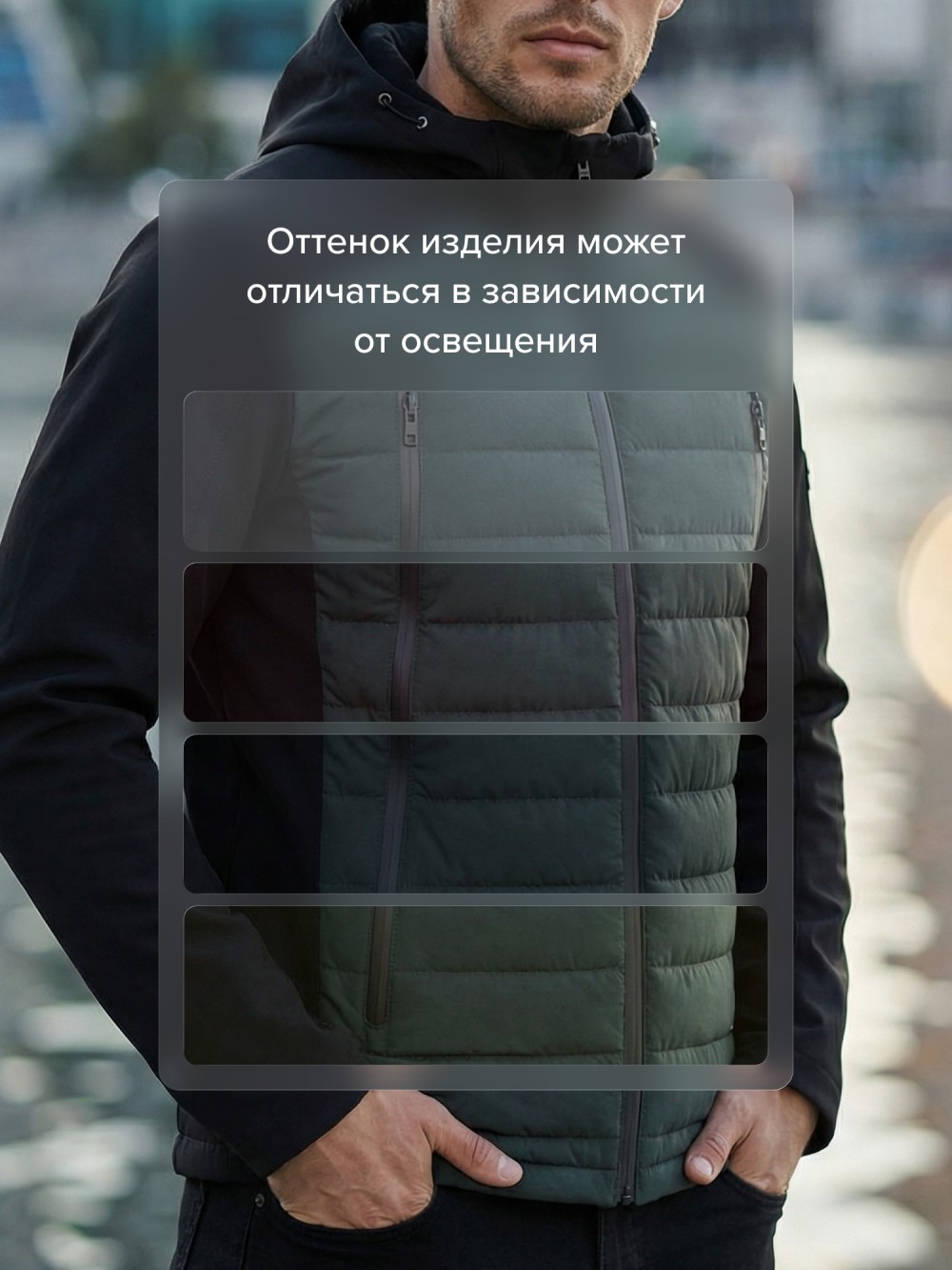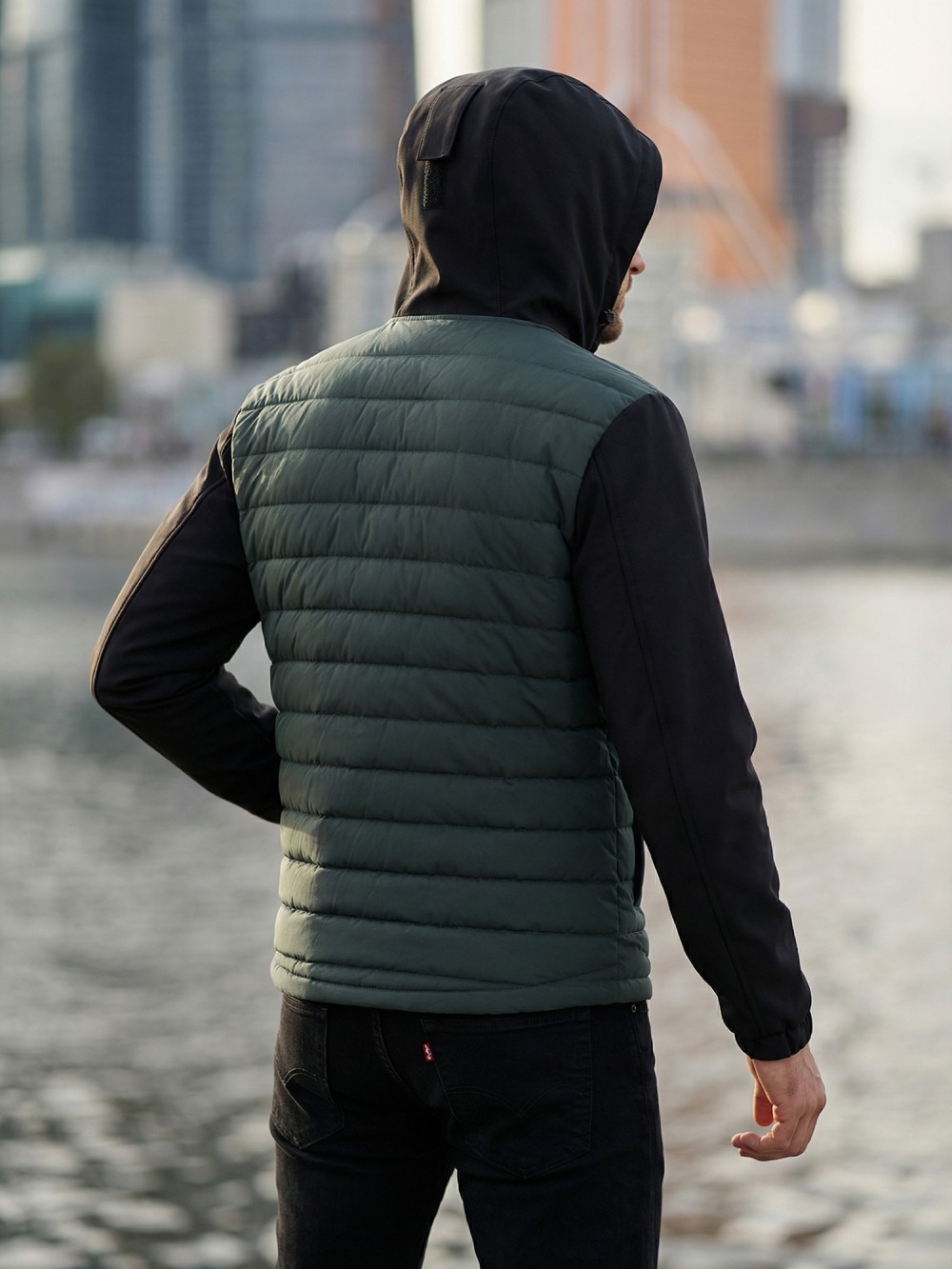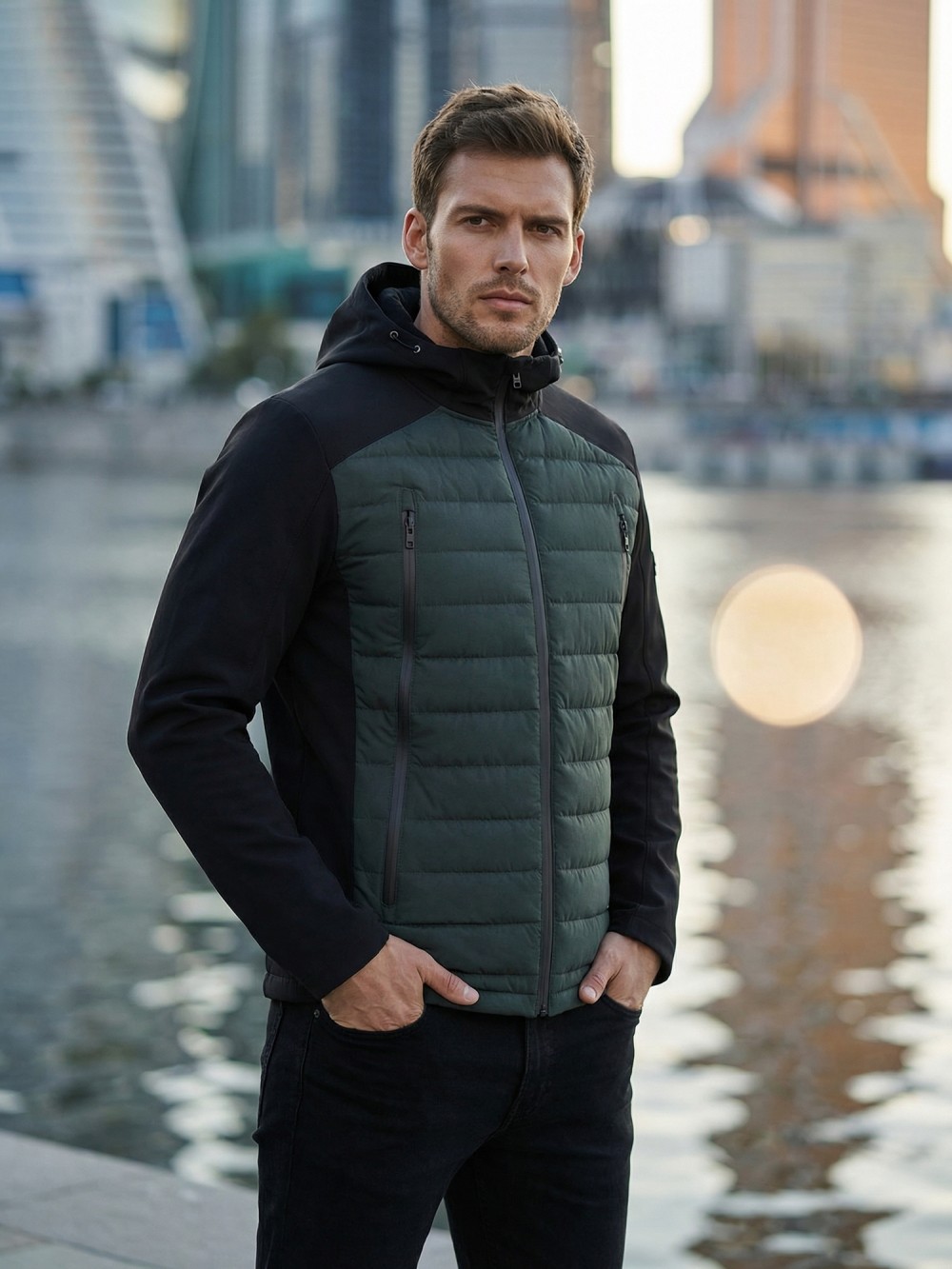 Современная мужская куртка гибридного типа сочетает в себе технологичную стёганую конструкцию и эластичные вставки из софтшелл-материала. Такая комбинация обеспечивает комфорт, свободу движения и оптимальную защиту от ветра и прохладной погоды.