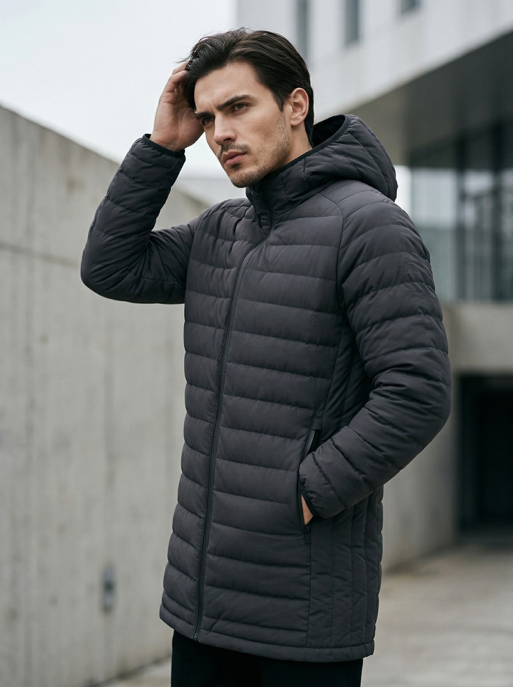 Удлинённый силуэт обеспечивает дополнительную защиту от ветра и создаёт ощущение уюта и защищённости. Капюшон помогает сохранить тепло и защищает от непогоды, делая куртку ещё более практичной для повседневной носки.