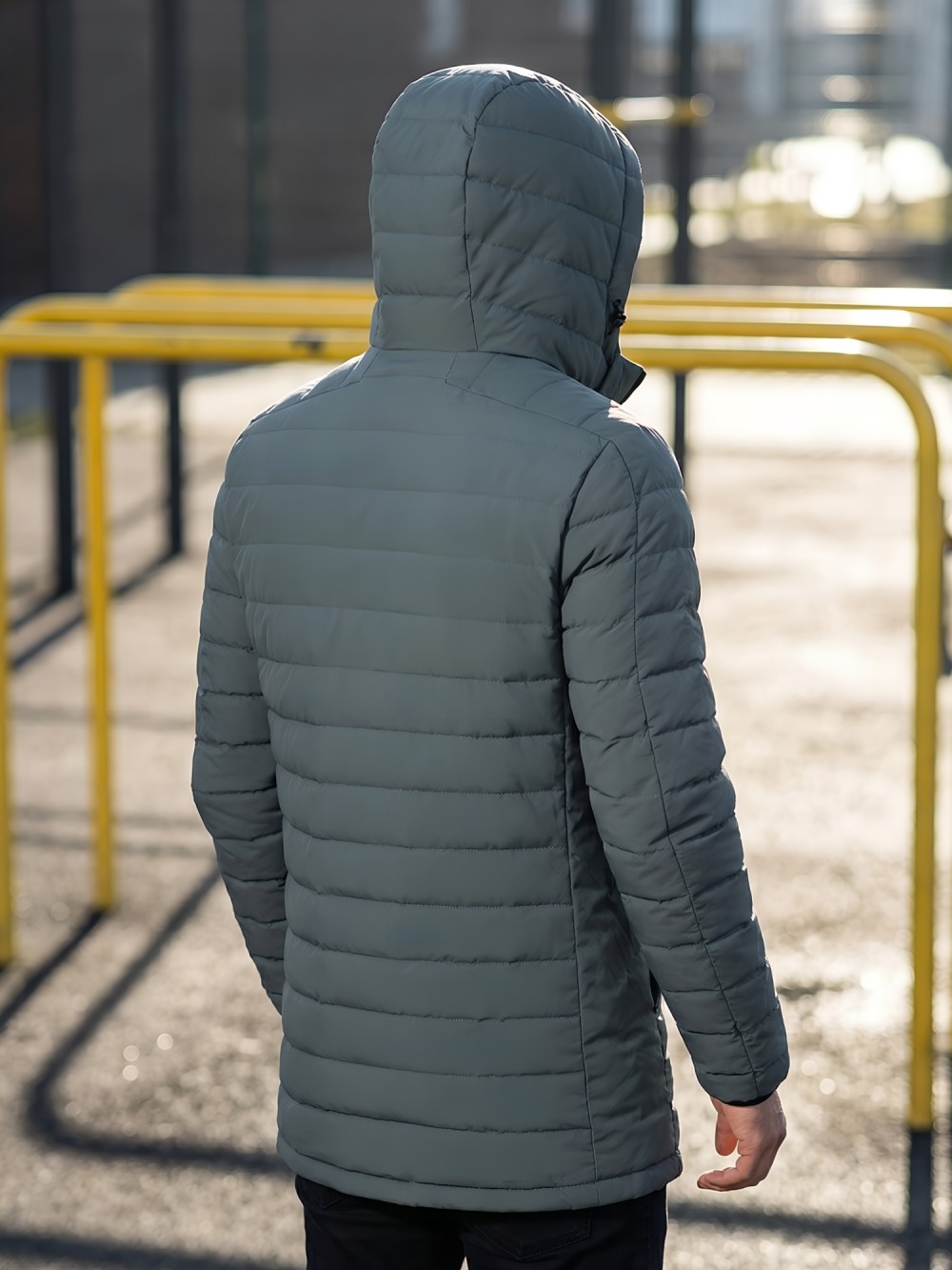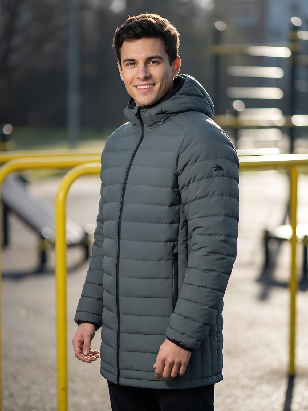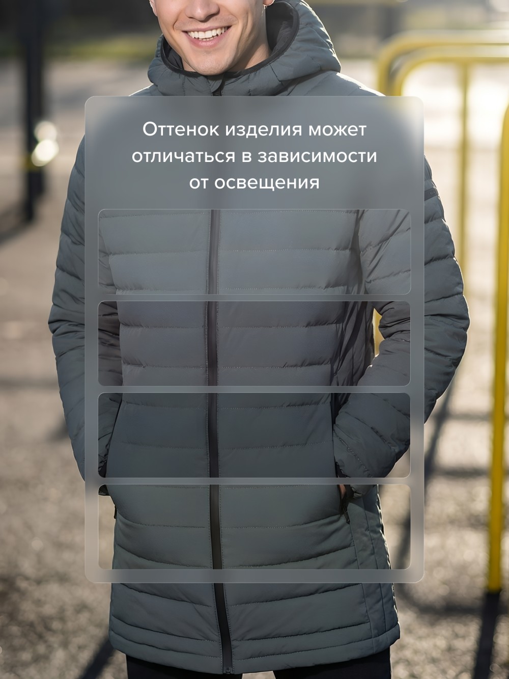 Удлинённый силуэт обеспечивает дополнительную защиту от ветра и создаёт ощущение уюта и защищённости. Капюшон помогает сохранить тепло и защищает от непогоды, делая куртку ещё более практичной для повседневной носки.