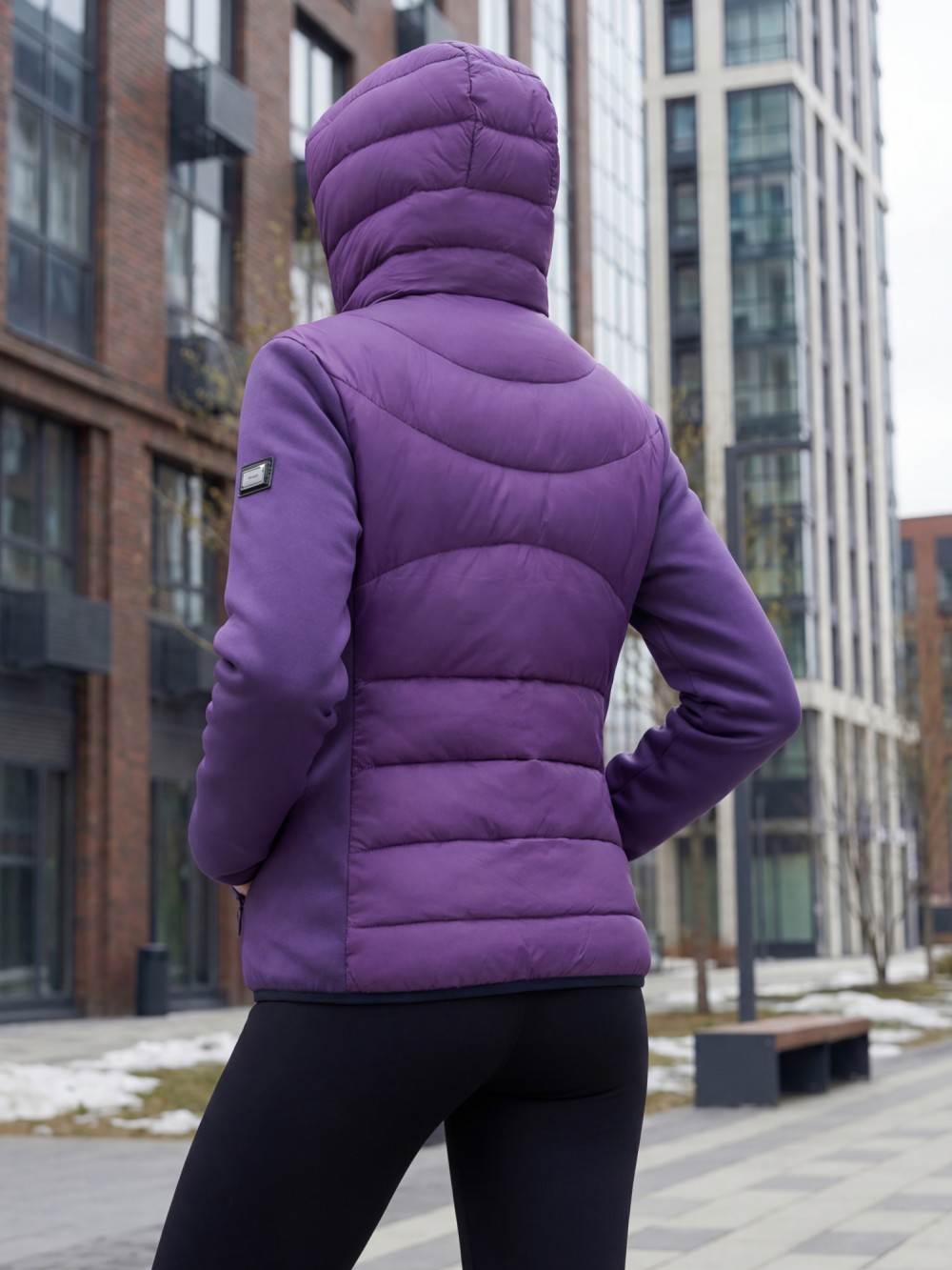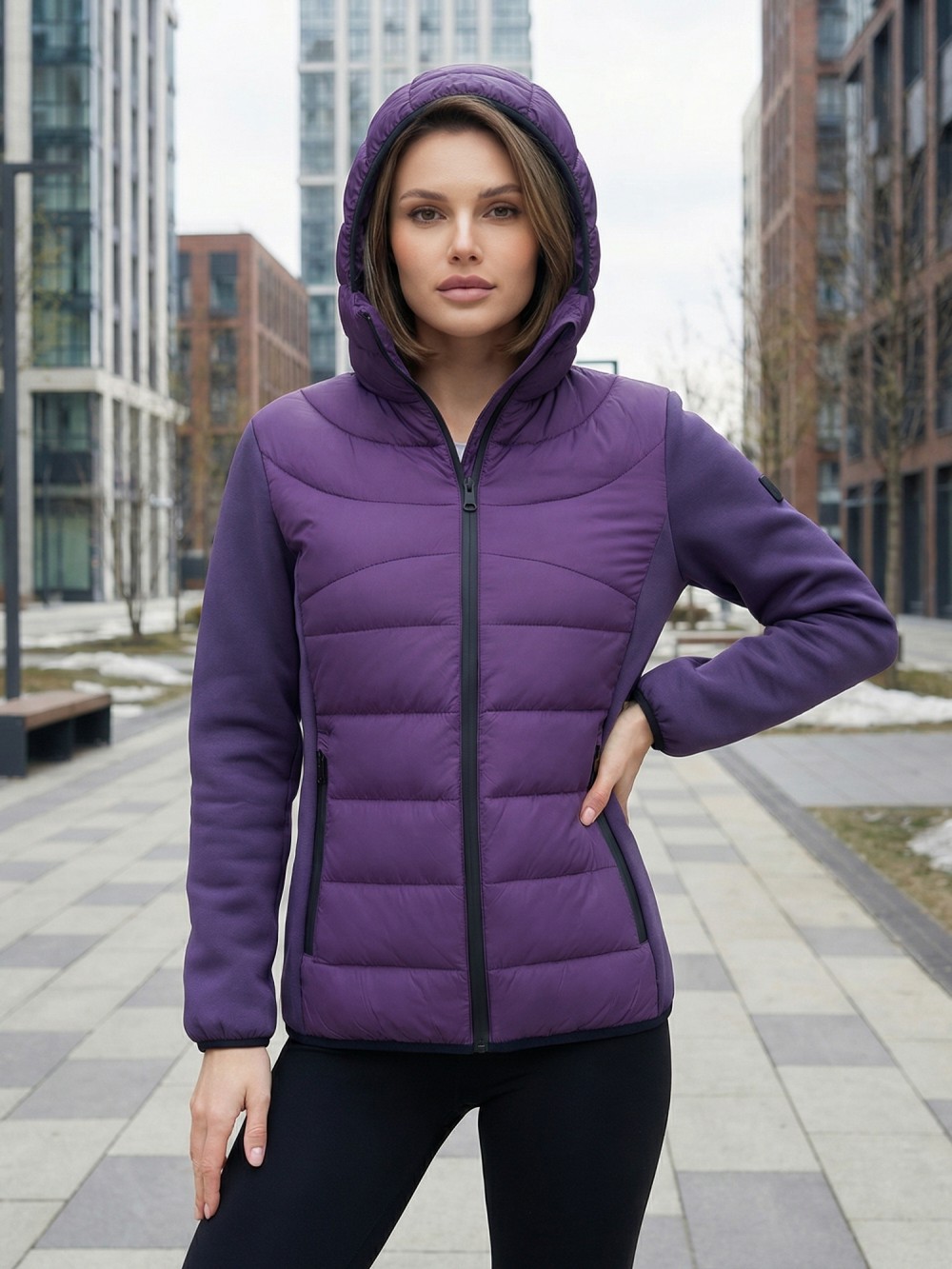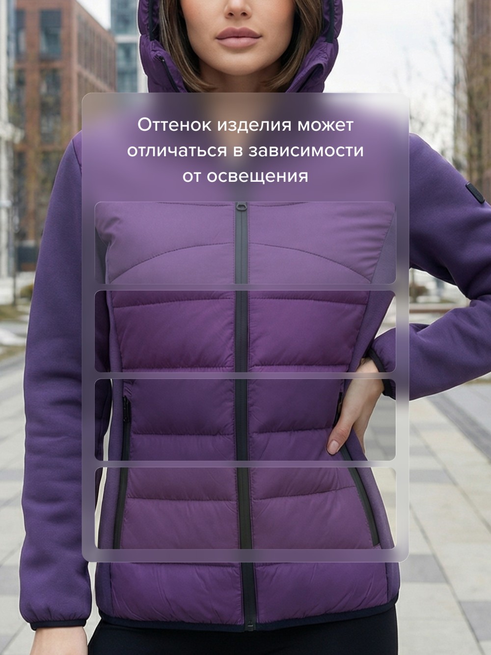 Куртка женская гибридная стёганая с капюшоном с графеновой подкладкой фиолетового цвета 9630_1F