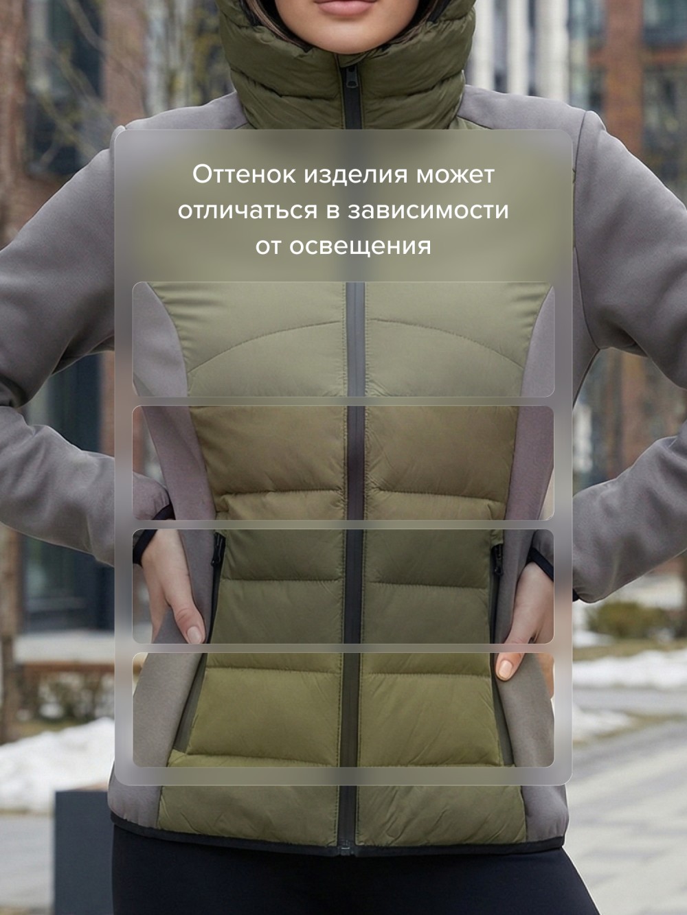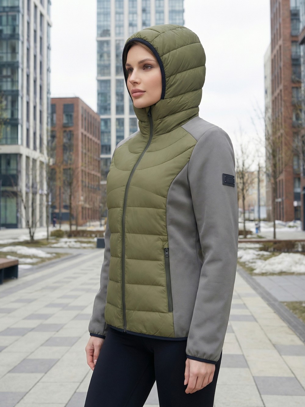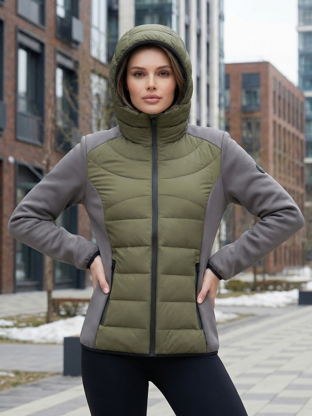Куртка женская гибридная стёганая с капюшоном с графеновой подкладкой цвета хаки 9626_1Kh