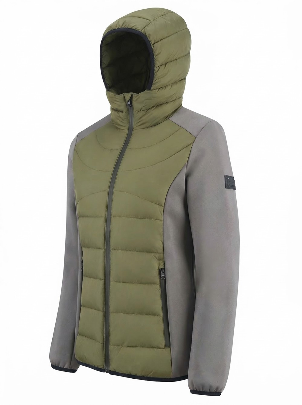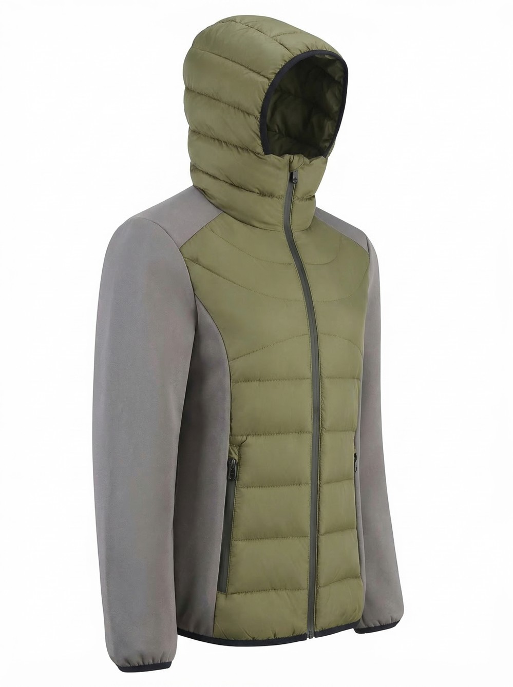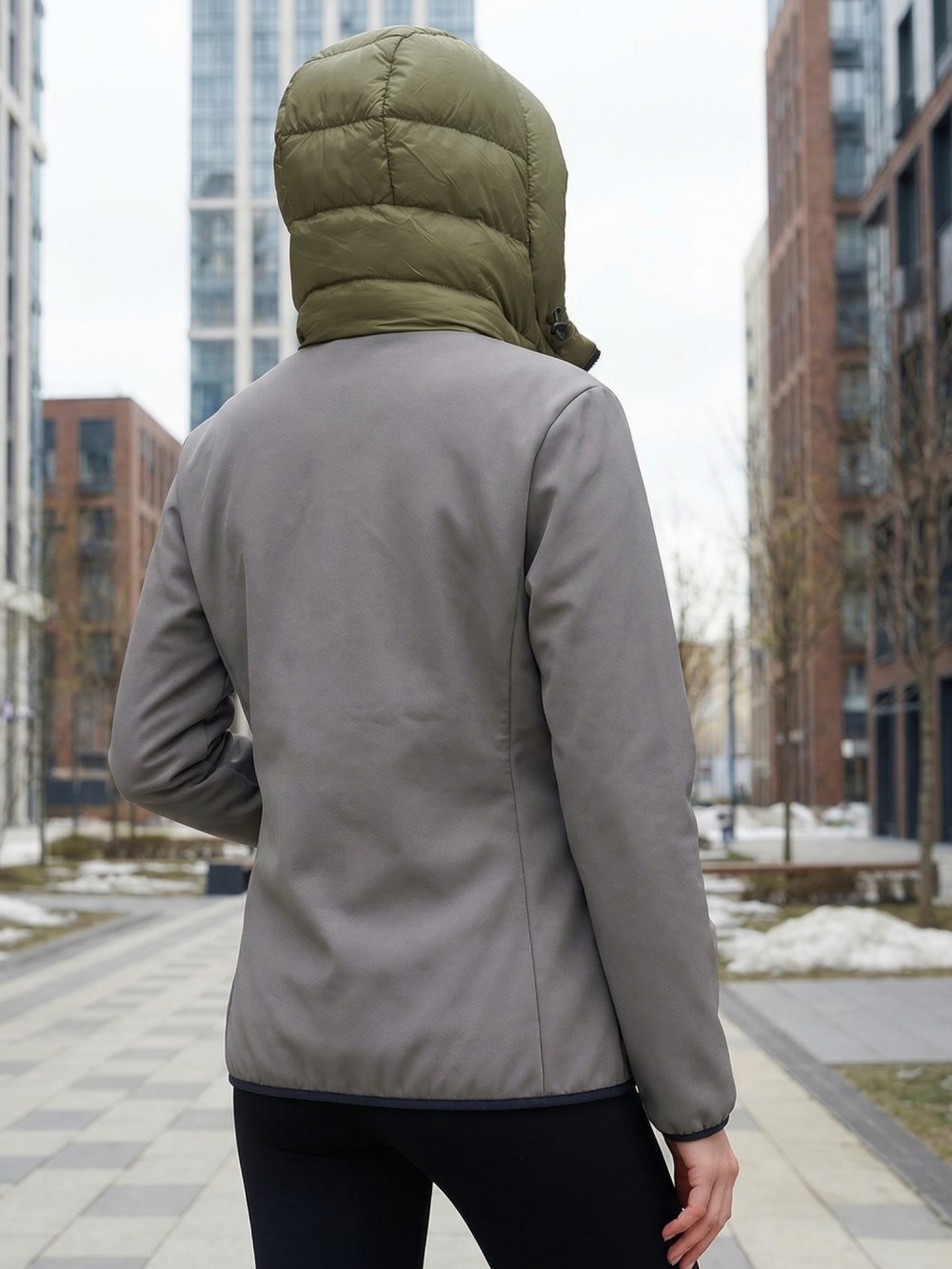Куртка женская гибридная стёганая с капюшоном с графеновой подкладкой цвета хаки 9626_1Kh