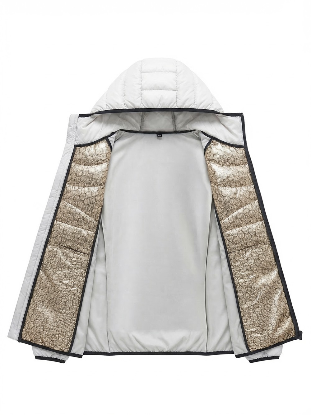 Внутренняя часть куртки выполнена из комбинированной подкладки: теплосберегающая фольгированная подкладка с графеновым покрытием помогает отражать тепло тела и сохранять его внутри, а мягкая флисовая подкладка создаёт дополнительное ощущение уюта и комфорта при носке. Такое сочетание материалов позволяет поддерживать комфортную температуру и делает куртку особенно приятной в прохладную погоду.