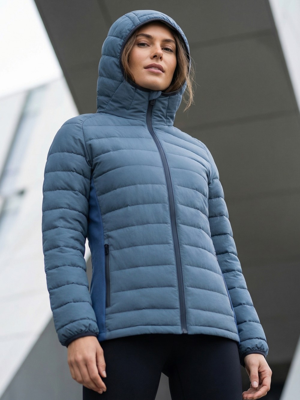 Женская гибридная стёганая куртка с капюшоном — лёгкая, современная и технологичная модель для повседневной носки в городе и активного отдыха. Куртка сочетает утеплённую стёганую конструкцию и эластичные боковые вставки, благодаря чему обеспечивает комфортную посадку, свободу движения и аккуратный силуэт.