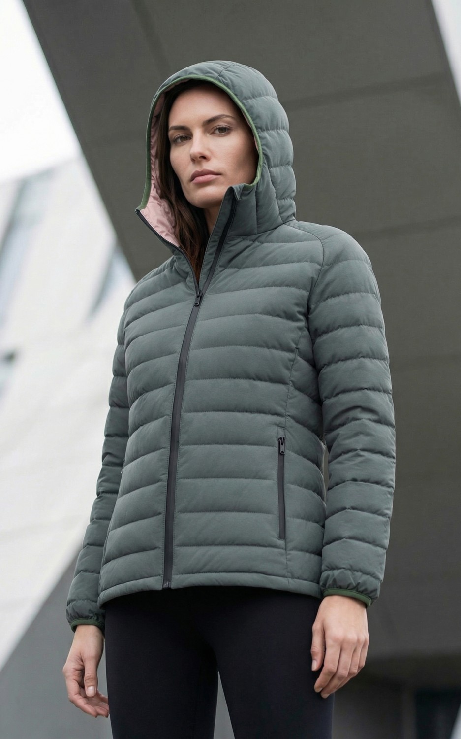 Куртка женская стёганая с капюшоном с графеновой подкладкой цвета хаки 9624_1Kh
