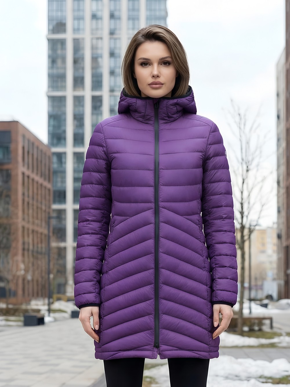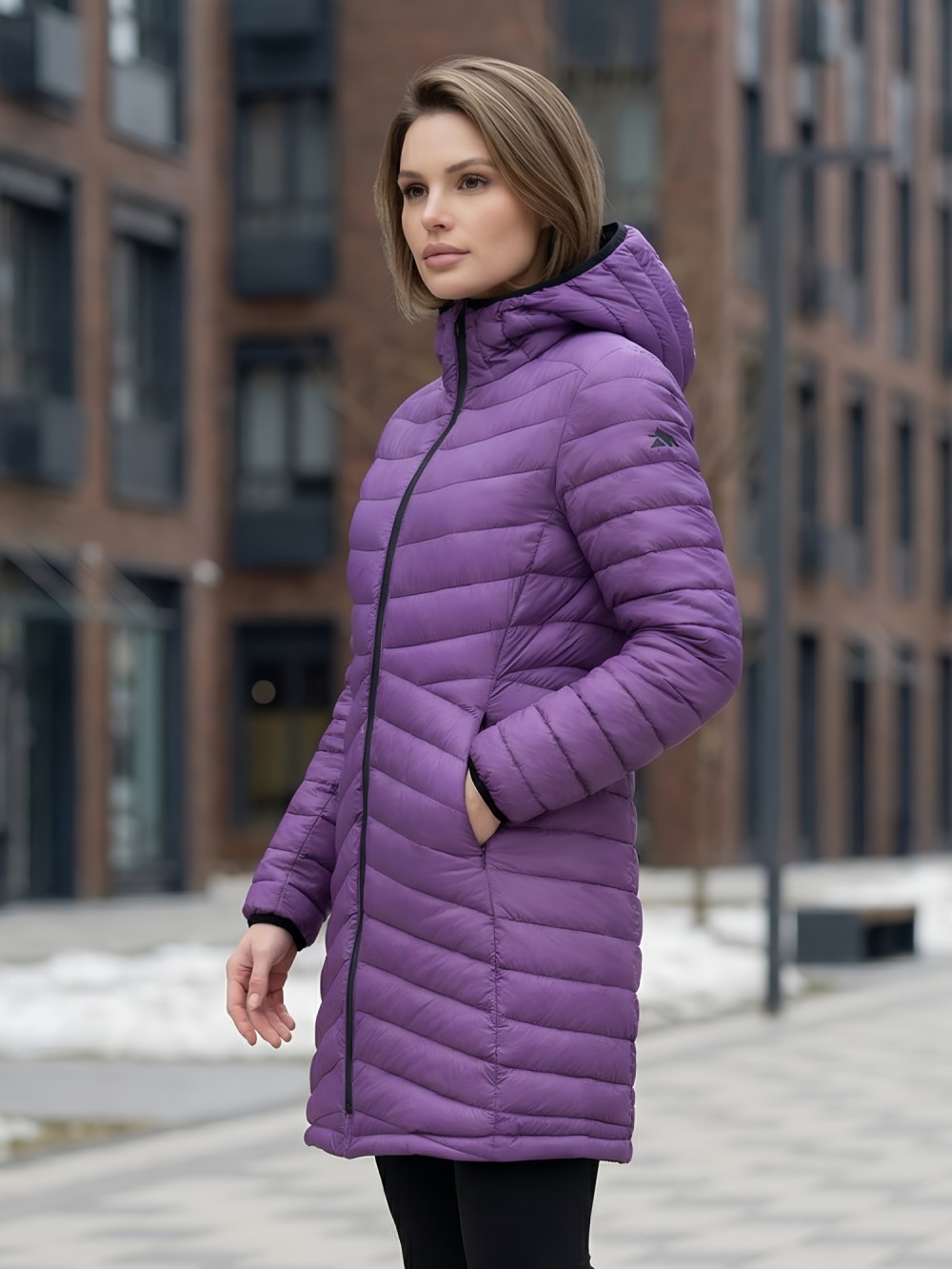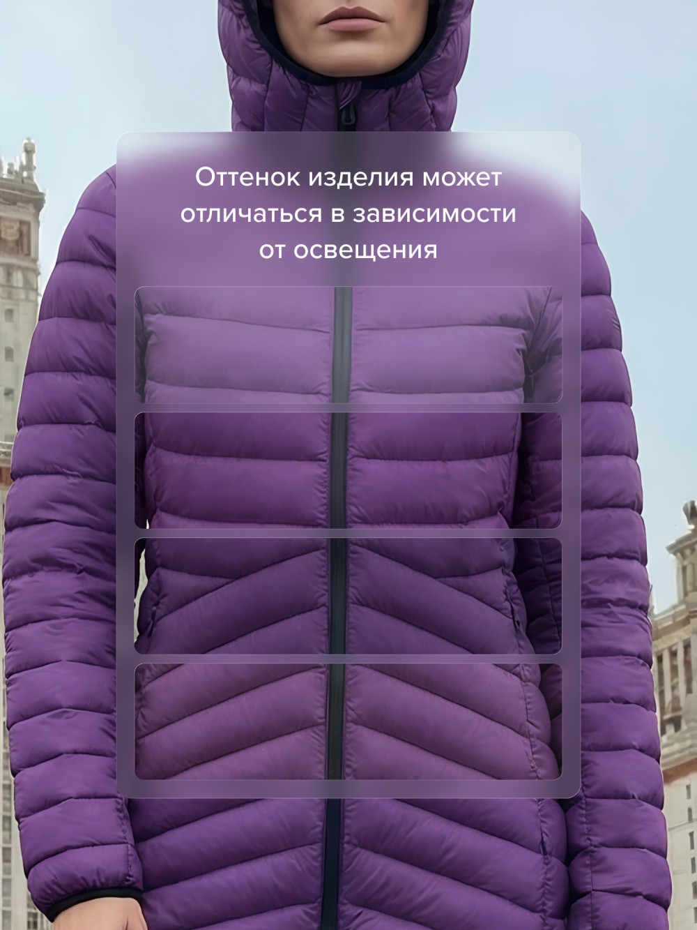 Куртка женская удлинённая стёганая с капюшоном и графеновой подкладкой фиолетового цвета 9628_1F