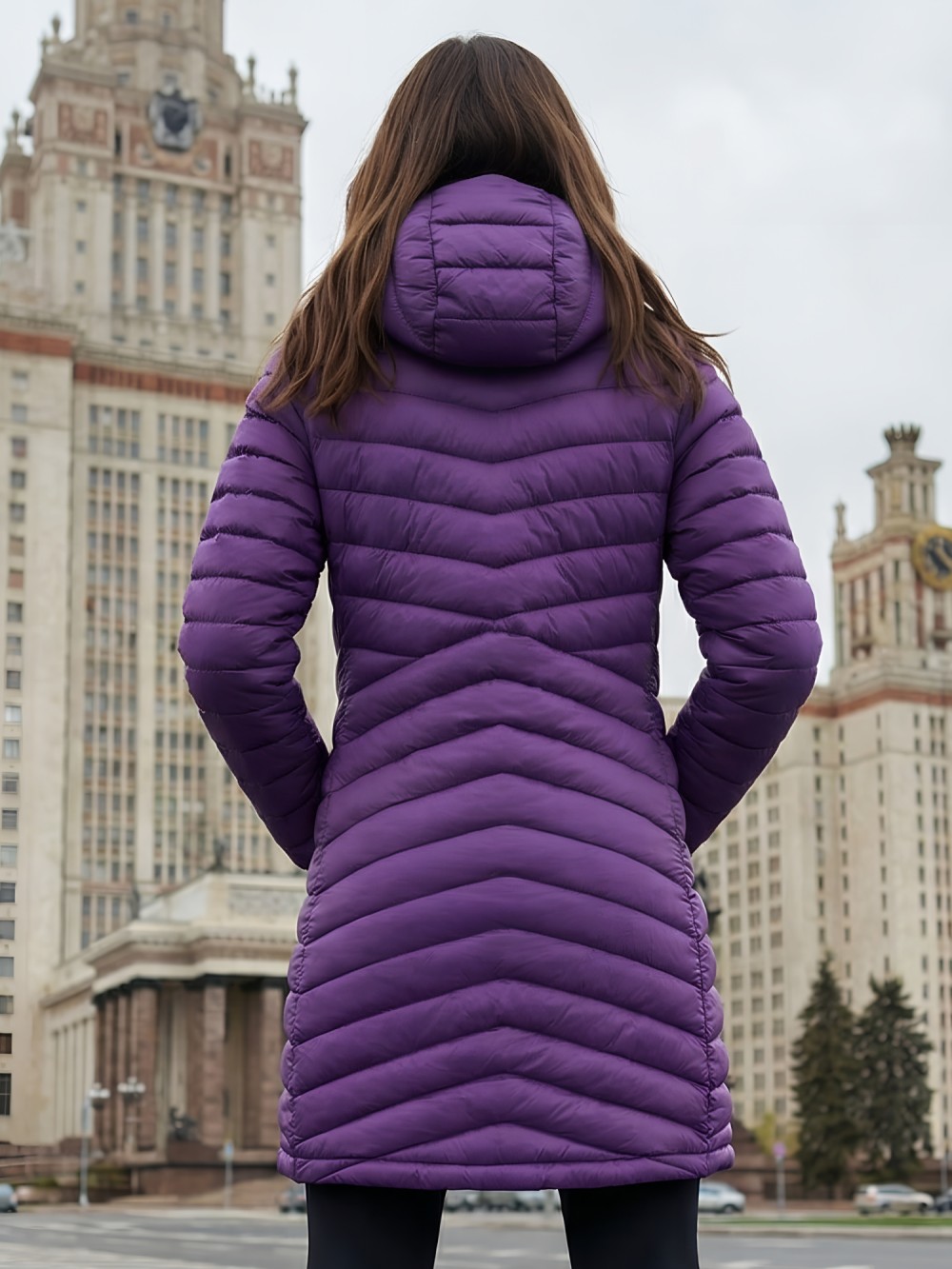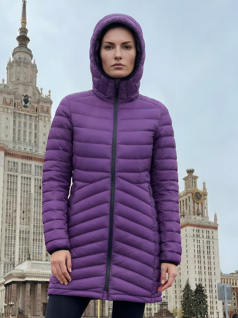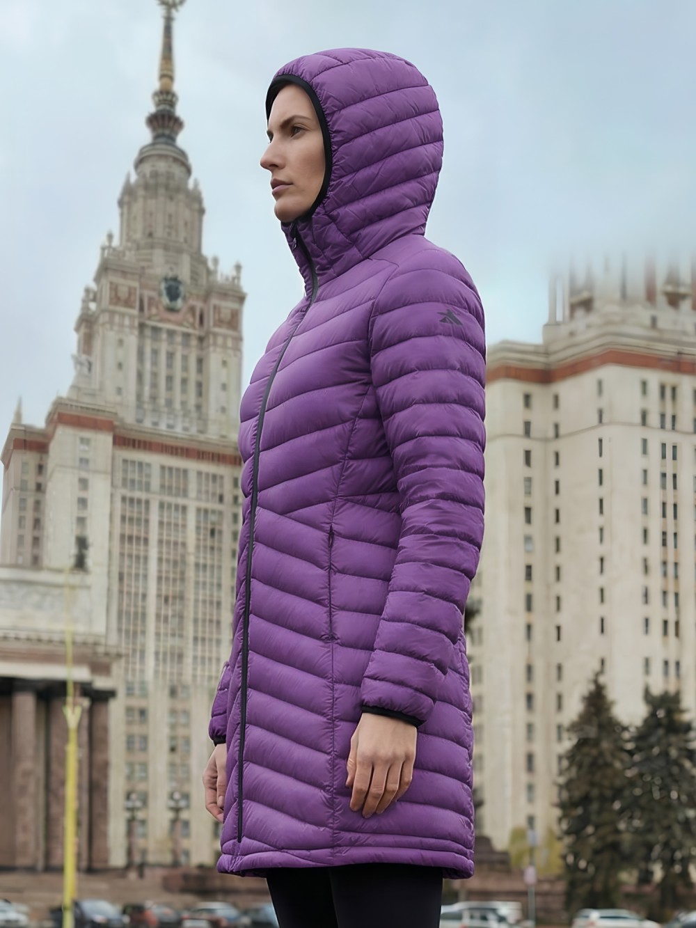 Удлинённый силуэт делает модель ещё более практичной — он защищает от ветра и создаёт ощущение дополнительного уюта. Капюшон помогает сохранить тепло и защищает от непогоды, делая куртку удобной для ежедневной носки.