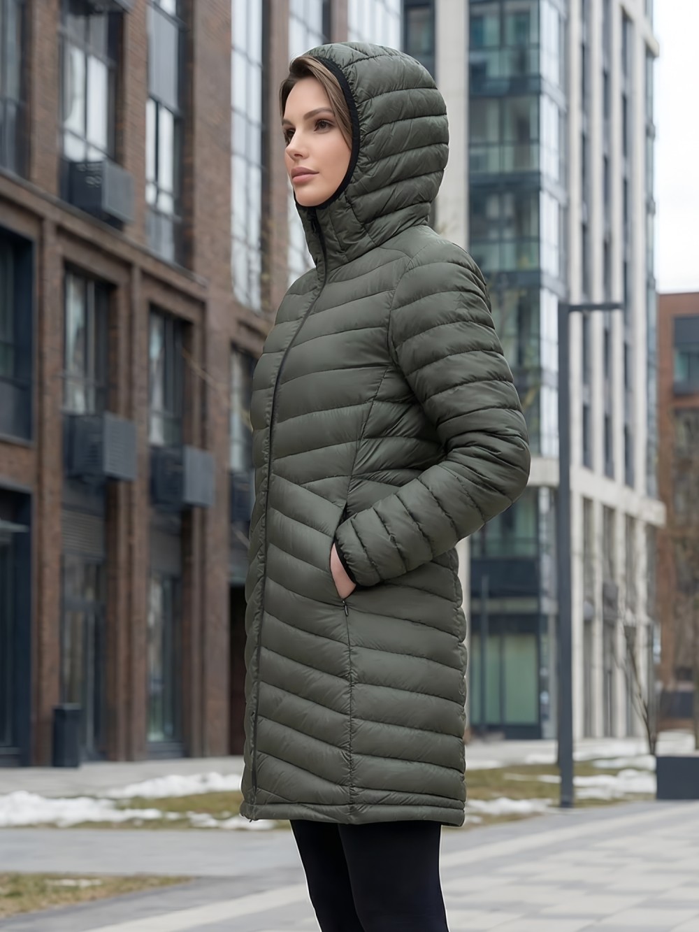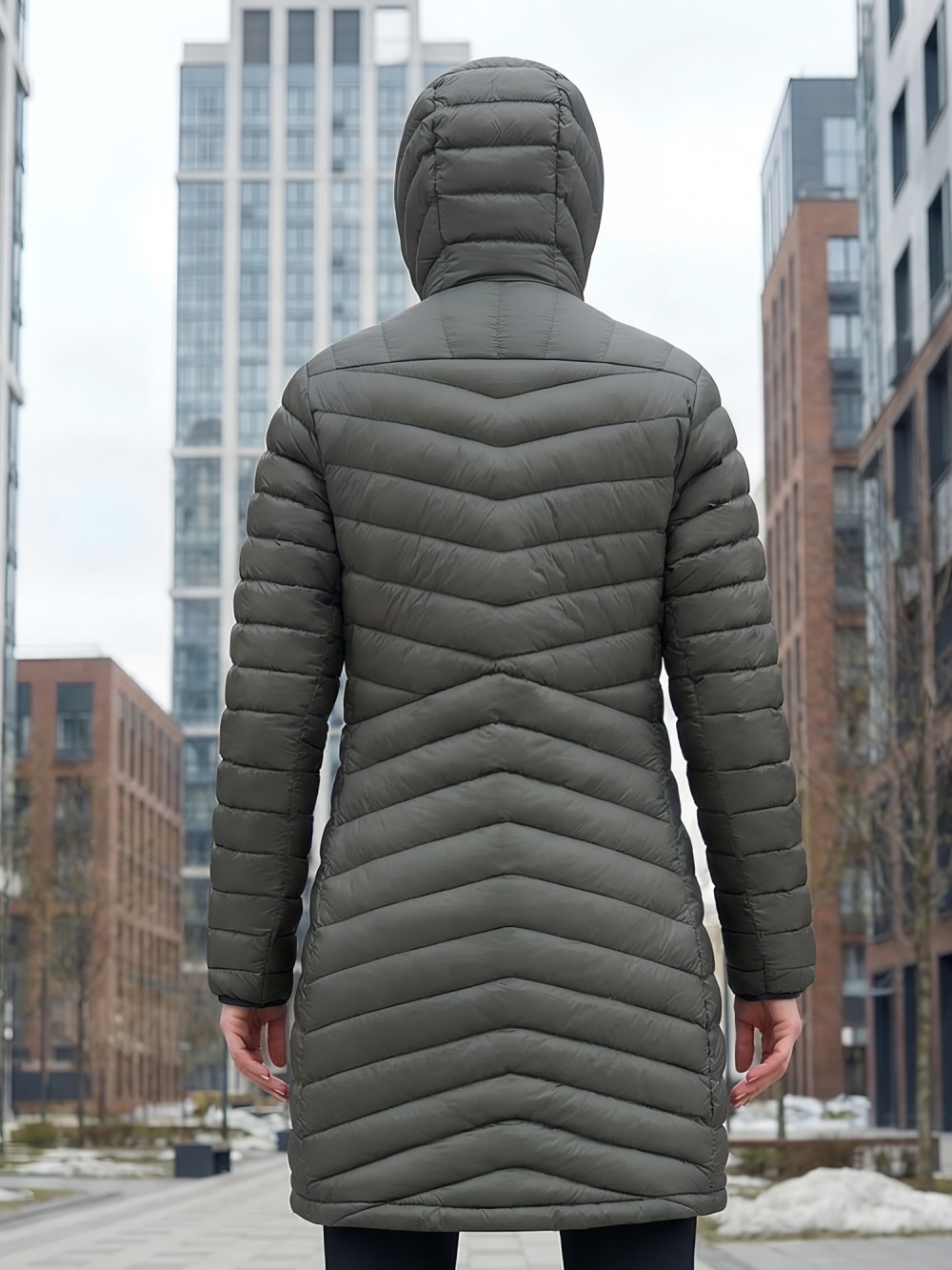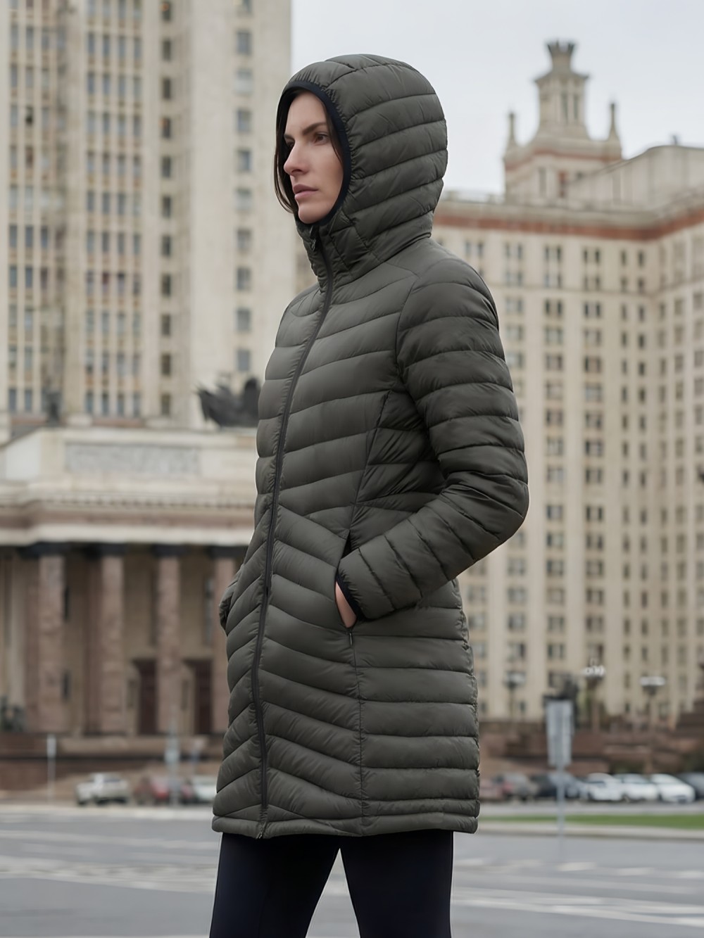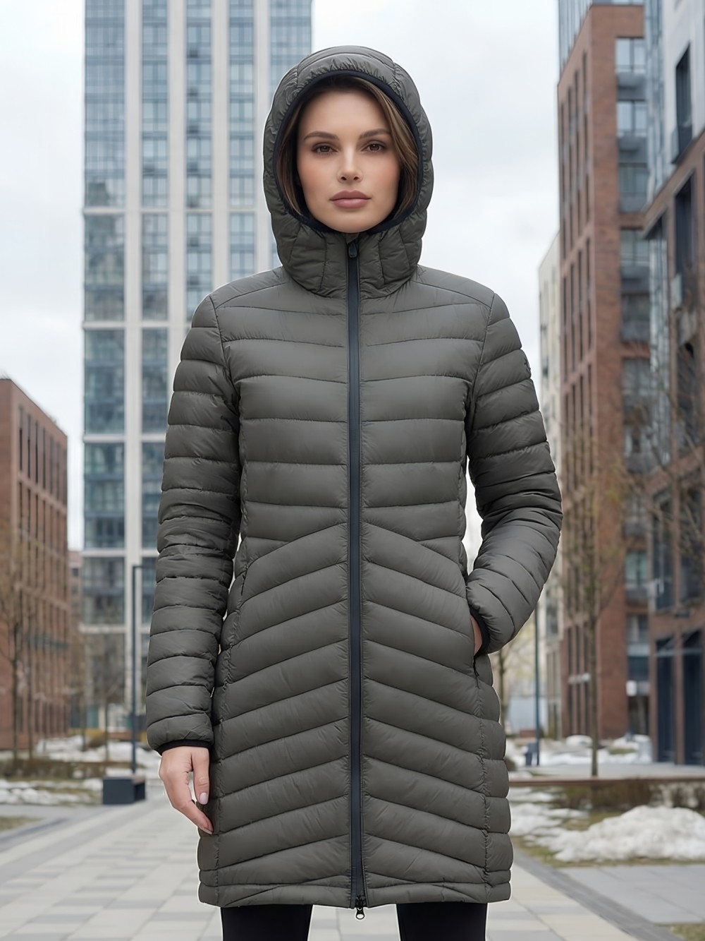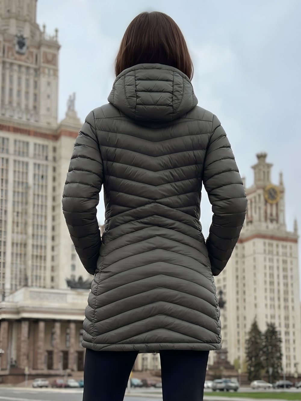 Удлинённый силуэт делает модель ещё более практичной — он защищает от ветра и создаёт ощущение дополнительного уюта. Капюшон помогает сохранить тепло и защищает от непогоды, делая куртку удобной для ежедневной носки.