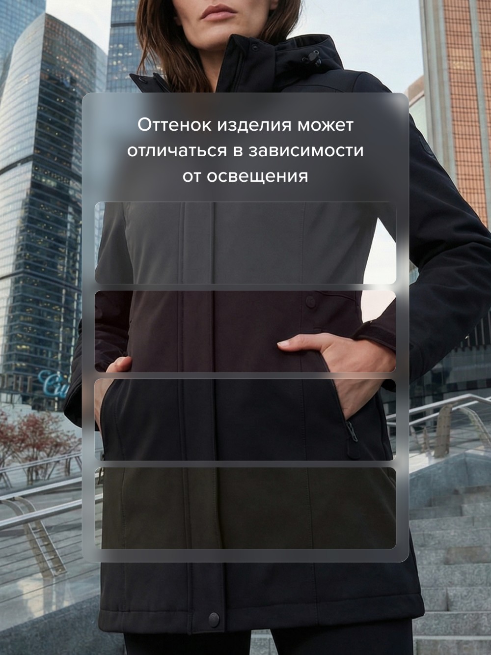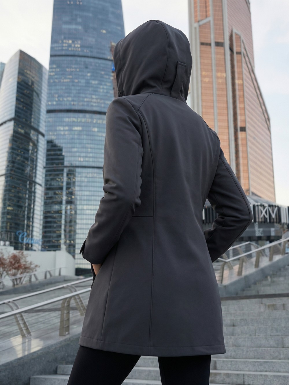 Парка женская софтшелл виндстоппер удлинённая с капюшоном черного цвета 9614_1Ch