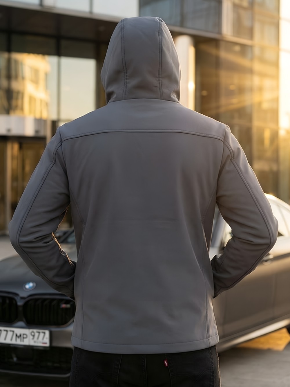 Ветровка мужская софтшелл виндстоппер с капюшоном спортивная темно-серого цвета 9617_1TC