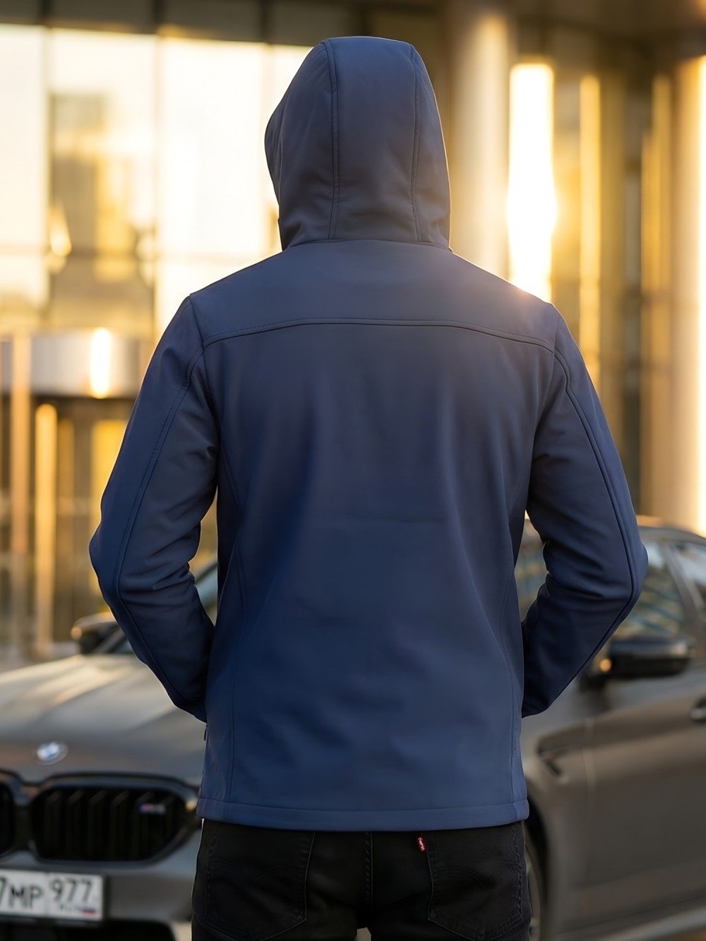 Ветровка мужская софтшелл виндстоппер с капюшоном спортивная темно-синего цвета 9617_1TS