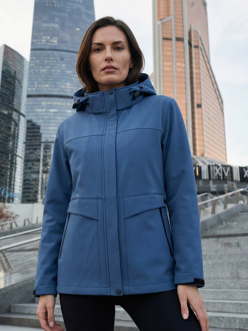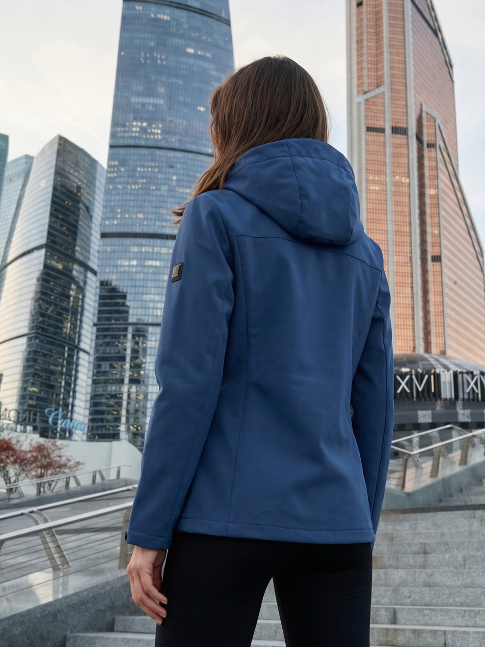 Ветровка женская софтшелл виндстоппер с капюшоном спортивная синего цвета 9616_1S